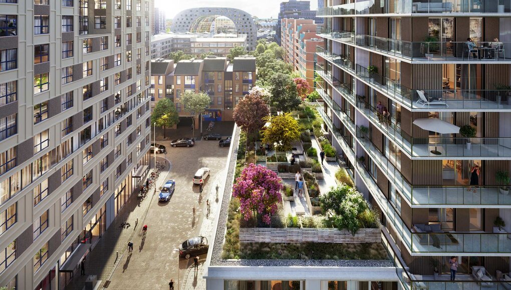 Op de vierde verdieping is er een collectieve daktuin. Hier kunnen de bewoners van de appartementen zich heerlijk terugtrekken om in de zon, of juist schaduw te zitten. In de stad is het tegenwoordig steeds belangrijker om ook voldoende schaduwrijke buitenruimtes te hebben. De daktuin heeft een urban robuuste uitstraling met houten plantenbakken van verschillende hoogtes. Zo is er plaats voor kleine bomen in de hoogste plantenbakken. Aan de zuid-oost zijde van de daktuin is in dezelfde verschillende hoogtes van houten bakken een urban farming. Hier kunnen bewoners hun eigen groente en fruit kweken en daarbij is ook plaats voor compost om hun afval her te gebruiken in de tuin.