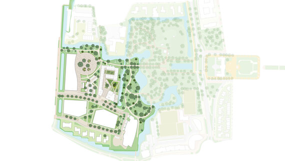 Het park loopt tot aan het gebouw, en zelfs het gebouw in. In Nexum ontstaat een oplopend rolstoel- en rollatorvriendiendelijk terras, van waaruit je iets verhoogd het park in kijkt. Aan de voet van dit terras bevindt zich het openbare terras van de ontmoetingsruimte met zicht maar ook beschutte plekken. Dit terras ligt op de kop van het gebouw aan de historische watergang en verbindt Nexum met de buurt. Hier zie je mensen zitten en lopen daardoor is er volop kans voor ongedwongen ontmoeting.