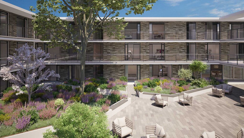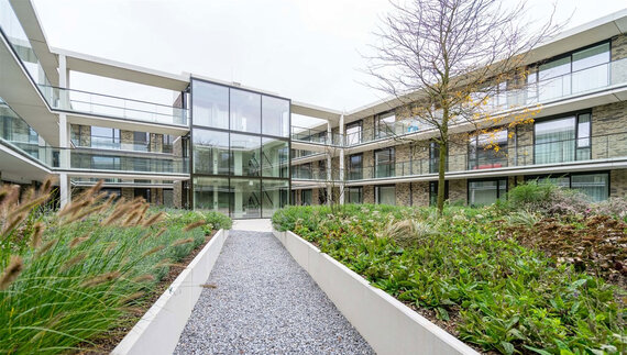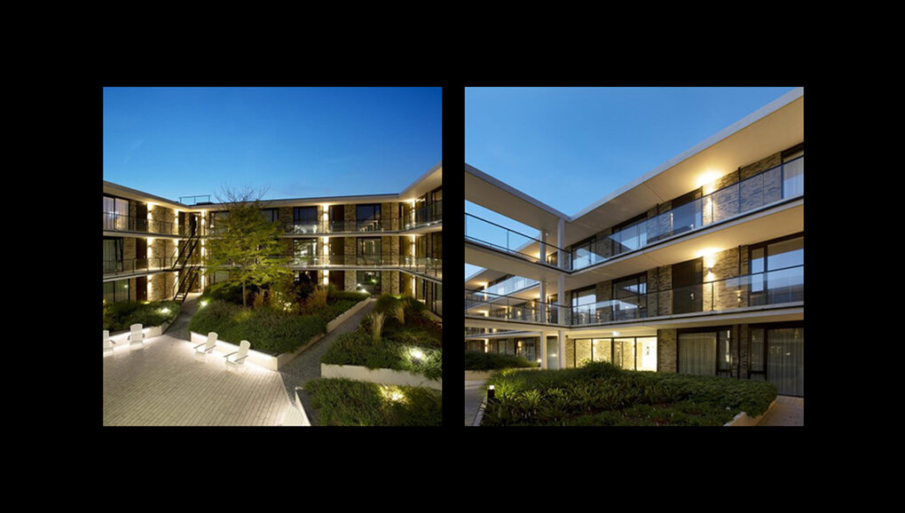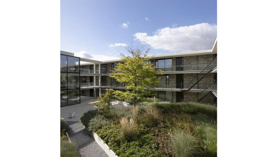 Het binnenhof geeft de bewoners en bezoekers een warm en royaal welkom door inpassing van een ontmoetingsplek. Een warme binnenplaats met allure dat wordt benadrukt door het gebruik van de hoogwaardige materialen uit de architectuur en de inpassing van kwalitatieve frisse beplantingen inclusief een volwassen boom met standplaats in volle grond door de parkeervloer heen.