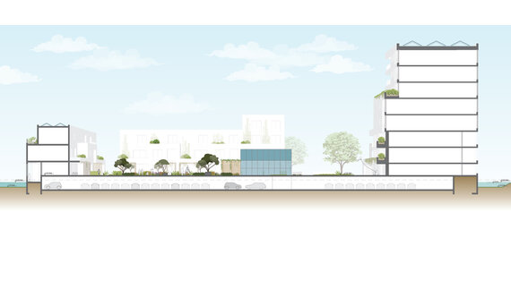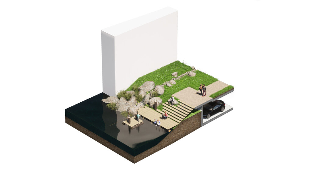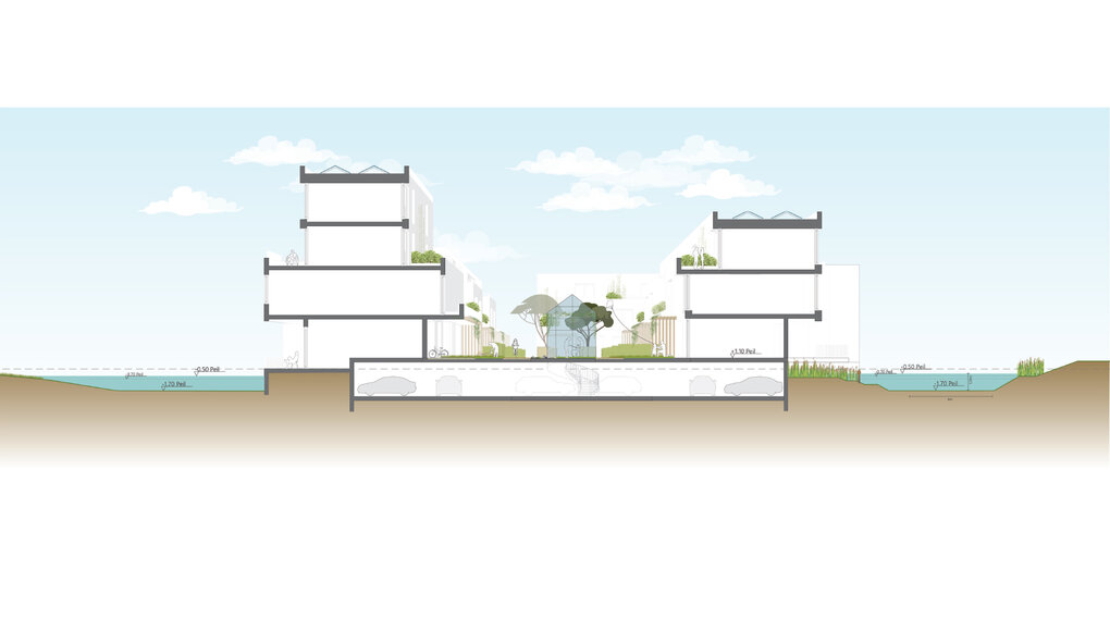 We kiezen voor het maken van één collectief hof en het parkeren te gebruiken om alle bebouwing en bewoners te verbinden. Het wEiland wordt een alzijdig blok met royale doorsnijdingen. De belangrijkste is de zichtlijn naar de BioHub. Deze zichtlijn start als groene route vanuit de laagbouw van de naastgelegen velden en eindigt in de trappartij naar het water in de wEiland. Hier ligt een kans voor een informeel trekpontje, stapstenen of een ander uniek speelobject in het Weidepark.