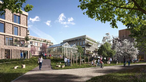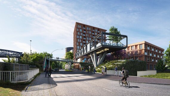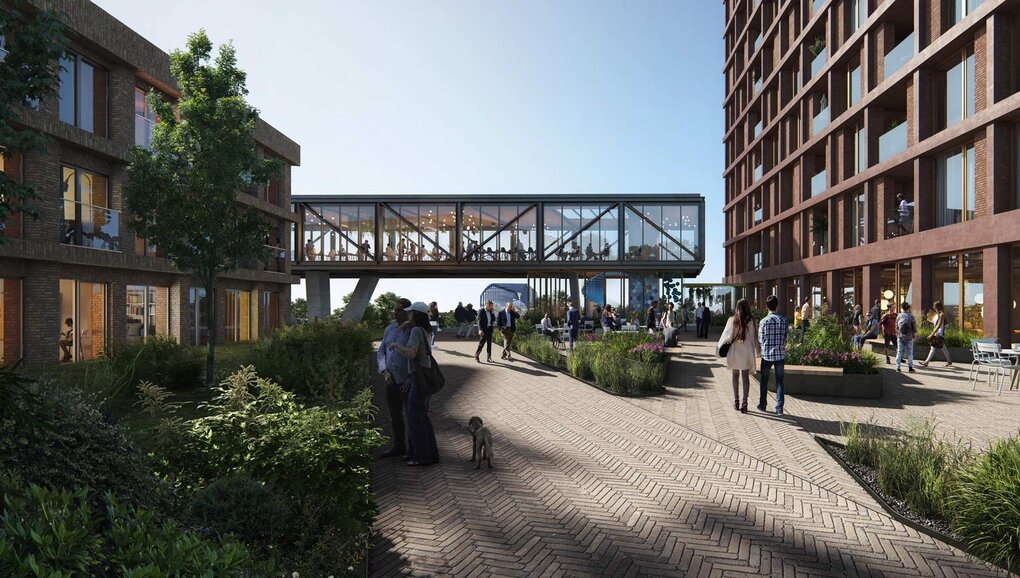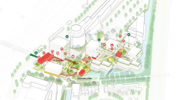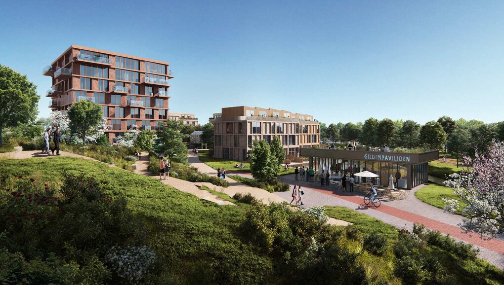 Het Gildenpark wordt de verbinder op gebieds-, buurt- en generatieniveau met voorzieningen die gezond gedrag stimuleren. Een fitnesstrack, gedeelde moestuin, XL picknicktafel, natuurspeelplekken aan het water, een mini openluchttheater en voldoende ruimte onder de bomen om bijvoorbeeld te picknicken. Het park krijgt een natuurlijke loop- en fietsroute naar het station voor de gebruikers van de kantoren. De extra brug over het water maakt een fijn ommetje mogelijk voor iedereen die in de buurt woont of werkt.