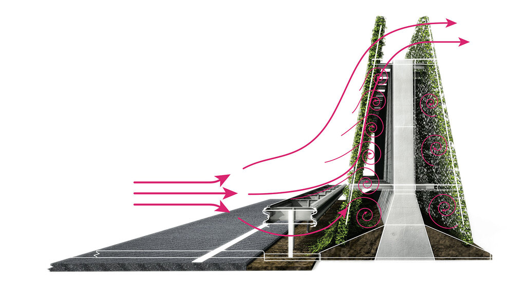 Dankzij de aanwezigheid van een beschermende begroeiing van klimop (Hedera in vele variëteiten), die op ruime afstand aan weerszijden van de kern wordt geplaatst, ontstaat er een tussenlaag die beduidend meer lawaai en fijnstof afvangt dan een traditioneel scherm. Door de ruimere spouw in de gepatenteerde Wall4life® geluidsschermen, wordt er een betere doorstroombaarheid voor wind en stof gecreëerd. Deze doorstroombaarheid zorgt er enerzijds voor dat het windklimaat gecontroleerd wordt, zodat ook bij wind vanaf de weg naar de ontvanger toe de akoestische voordelen niet teniet worden gedaan. Anderzijds zorgt de doorstroombaarheid ervoor, dat er meer lucht langs de bladeren stroomt en er door de versterkte filtering achter het scherm een groter gebied van zuivere lucht ontstaat met beperktere indringing van het stof. De uitstraling van de groene geluidswand is deze overal inzetbaar, in tegenstelling tot hardere materialen, zoals beton en glas, die vaak door omliggende bewoners worden geweerd.