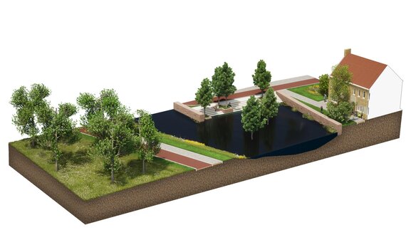 In het centrumplan wordt de grote waterpartij met een tribune trap de speciale ontmoetingsplek aan het water. Hier fiets en wandel je vaak langs en kom je de buren tegen. Met de bomen die het water in wandelen, is dit bijna een kunstelement. Zo geven we de woningen aan het park een extra kwaliteit. Op de schanskorf kan je even gaan zitten om over het water uit te kijken.