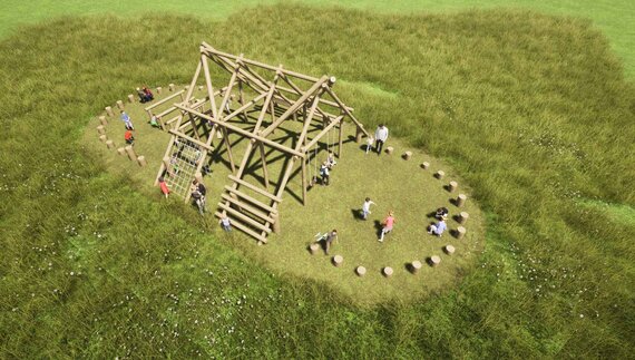 Ook de robuuste speelplaats die in het park komt, is een verwijzing naar de opgravingen. Archeologen vonden hier de restanten van een woonboerderij uit de Bronstijd. Dit ‘longhouse’ inspireerde ons om een geraamte te maken van houten palen waarop kinderen kunnen klimmen en klauteren. De vorm is eigenlijk de ‘footprint’ van de woning. In deze speelplaats komen ook schommels, een glijbaan en een klimrek. Zo dicht bij de school wordt het de ontmoetingsplek in de buurt.