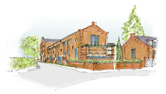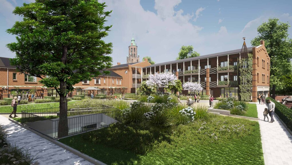 In de jaren dertig is architect Leeuwenberg in Huissen actief voor de uitbreiding van de Middeleeuwse kerk, de bouw van het St. Elisabeth convent en de bouw van de R.K. jongens en meisjesschool op de plek van de Aloysiusschool, allen in een traditionalistische aan de Delftse school van zijn leermeester verwante architectuur. Hier hebben wij ons door laten inspireren. Aan de Langekerkstraat hebben we de nieuwe gevel geplaatst op de plek waar voor de oorlog de lagere school stond, ontworpen door ir. G.M. Leeuwenberg. De kenmerken waaruit je de inspiratie kan afleiden zijn de eigen entrees met trapjes en hekwerk, de Franse balkons, de diamant vormig metselwerk details en raampjes. De totale gevelcompositie is opgedeeld in de wijze van Granpré Molière, waarbij de gevelopeningen ritmiek geven en de fries de dakrand af maakt. Architectuur en het intieme hof met dektuin komen samen door hier ook sommige entrees te maken. Daarnaast is er groen tot aan de voordeur door het maken van de pergola met klimplanten.