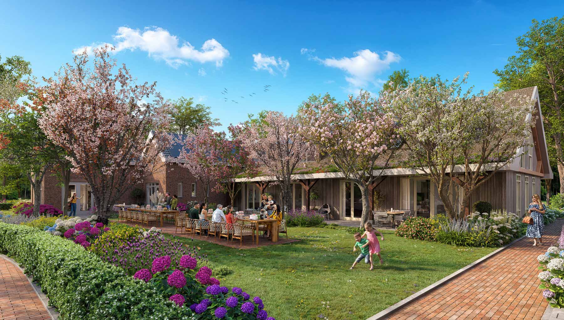 In het landgoedgedeelte krijgt het woonprogramma een statig en verfijnd karakter, met een stijlvolle knipoog naar de architectuur van Schipluiden. Hier wordt verwezen naar iconische panden uit het dorp, zoals het Oude Gemeentehuis, dat met zijn symmetrische gevel en grandeur inspiratie biedt voor De Residentie. Dit gebouw vormt het middelpunt van het landgoed, gelegen aan een oprijlaan, begeleid door bomen en geflankeerd door directeurs- of poortwachterswoningen.