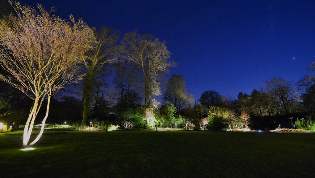 De ontwerpprincipes waren om licht en ruimte te geven aan het moderne grootse ontwerp van het huis en te spelen met de geborgenheid en openheid van de typische bostuin met solitaire bomen.