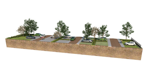 Het parkeerterrein is gematerialiseerd naar de verschillende gebruiksintensiteit. Aan de buitenkant van het parkeerterrein zal minder intensief gebruikt gemaakt worden van de parkeerplaatsen daarom is hier gekozen voor een gefundeerde grasparkeerplaats. Dichtbij de entree is de parkeerintensiteit het hoogst en hier zijn de parkeerplaatsen uitgevoerd met normale dichte verharding. Het grootste deel van de parkeerplaatsen worden uitgevoerd met open verhardingselementen, de KAP steen. Deze CO2 arme Reduton parkeerstenen laten ruimte voor infiltratie en groen maar maken uitstappen ook comfortabel.