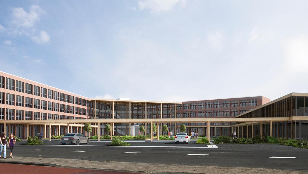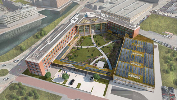 Een droogloop langs de twee bouwvolumes vorm het bindende element met een groot gebaar in de nieuwe centrale entreehal, het Atrium. CBRE was verantwoordelijk voor het nieuwe werken en het interieur, Powerhouse Company ontwierp de schil en de winkel transformatie en LAP Landscape & Urban Design ontwierp de buitenruimte en het parkeren.