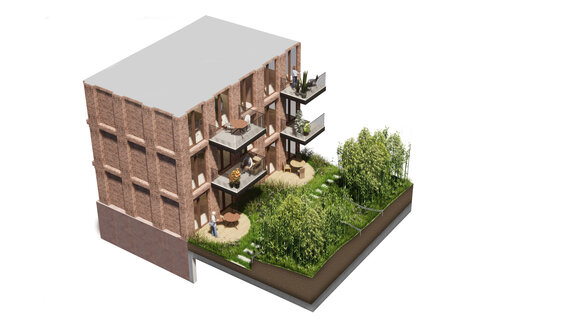 Gelijkvloers wonen maar wel met een tuin en bovendien een tuin die je niet zelf hoeft te onderhouden. Woningen aan de binnentuin zijn belangrijk voor sociaal toezicht en geven levendigheid op de rustige uurtjes. In de tuin zijn ook plukjes hogere planten opgenomen zodat er ook privacy is naar de publieke binnentuin.