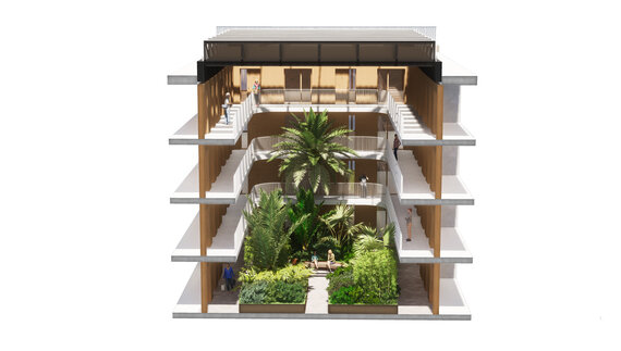 Het atrium van het bouwblok is een gemeenschappelijke tuin van de bewoners van het blok. Hier wordt ontmoeting gestimuleerd, maar kan je jezelf ook even rustig terugtrekken. Doordat de galerij geheel rondom de tuin ligt voelt het geborgen maar ook als een sociale en veilige plek. De sfeer van de tuin is vergelijkbaar met Het IJzeren Hart. Met ronde bankjes verborgen in het groen. Hier kun je goed samen en alleen vertoeven. De beplanting staat in een grote bak, zodat ook bomen er goed kunnen groeien. De meer tropische donkergroene tuin steekt prachtig af tegen de warme hout kleuren van de binnengevels.