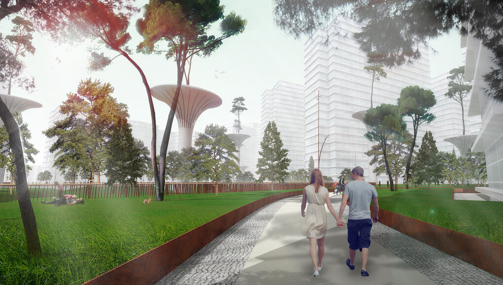 On the former factory site of Serp I Molot a new development was projected by Moscow’s leading development company DonStroy. AM Proektus architecture office designed a ring of residential towers defining a central green field with underneath it a very large parking garage for three thousand cars and other daily necessities and services. For this 5000 future inhabitants project. LAP Landscape & Urban Design was commissioned in the beginning of the year 2013 to design a landscape park on top of this parking garage with its all installations.