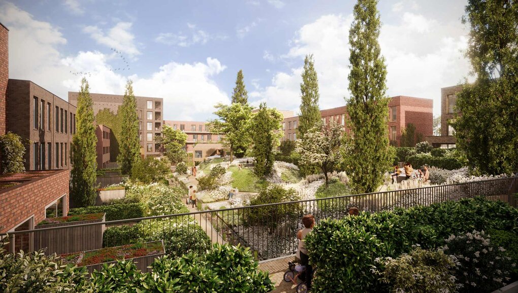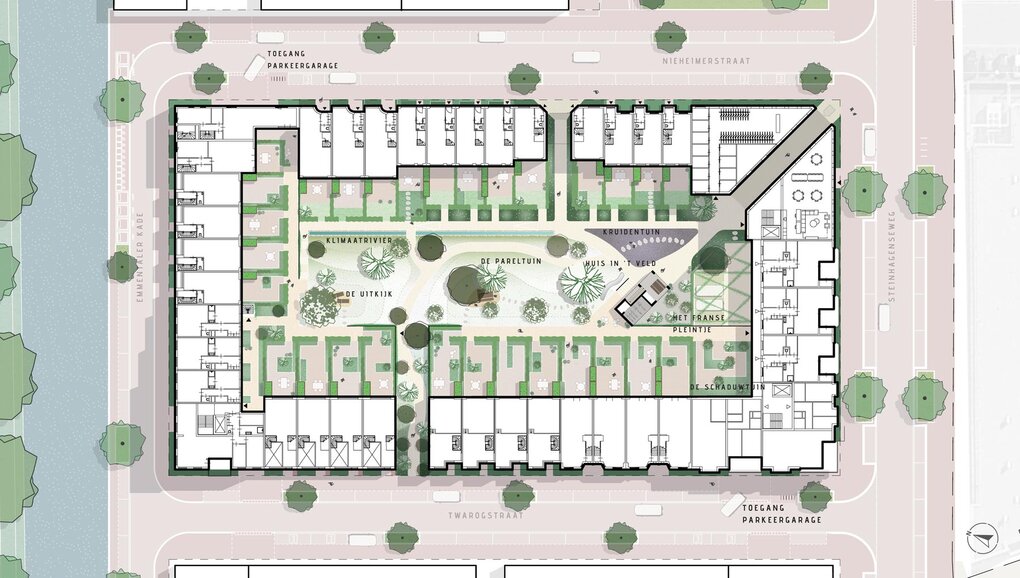 Passanten worden uitgenodigd naar deze route door het iconische Huis in ’t Veld in de binnentuin, die als het ware gestanst is uit het appartementen volume. De doorkijk maakt je nieuwsgierig naar de binnenwereld. Waarin het bloemenveld met het lichte bos het collectieve groene hart is van het bouwblok. Alle bewoners en vredige bezoekers kunnen hier elkaar ontmoeten en kinderen heerlijk spelen. Om de groene vingers aan te wakkeren is er in het Huis in ’t Veld een ontmoetingsplek voor de tuinierders.