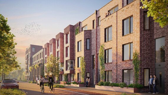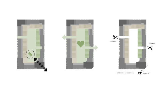 Haaks op de autowegen creëren we een kindvriendelijke speelroute en leggen we de verbinding met de naastgelegen bouwblokken. Dat doen we door drie poorten toe te passen, ieder met een eigen identiteit.