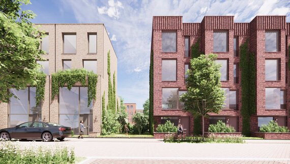 Bouwblok B2 presenteert zich aan de Steinhagenseweg als de kop en het welkom van Snellerpoort. Voor ons was de referentie ‘Poort van Woerden’ en de diagonale afsnijding van de typische 19e eeuwse stationsbuurt bouwblok snel gemaakt. Deze hoek verdient een uitgesproken stedenbouwkundig element, zonder te concurreren met de kerk ‘Het Baken.’