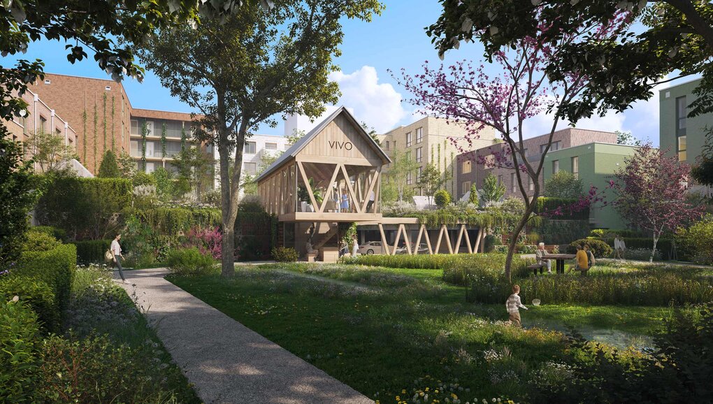 Het plan vormt een natuurlijk verlengstuk van het Snellerpoort park. Het park stroomt letterlijk door het bouwblok heen met de start van groene scharrelroute door alle bouwblokken van de nieuwe wijk. Vivo geeft een mooie plek met een openbaar toegankelijk pocketpark met een arboretum - museum van bomen. Overal zijn plekken gecreëerd voor ontmoeting, rust en spel — van de gemeenschappelijke daktuinen tot de private tuintjes met de karakteristieke Vivo-tuinhuisjes. Het Vivo Paviljoen vormt het hart van het plan: een ontmoetingsplek waar buren elkaar vinden, met ruimte voor gedeelde momenten in het dagelijks leven.