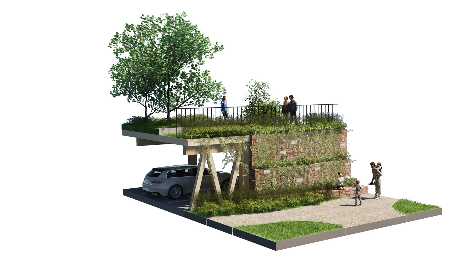 De 'Vivo Wall', als levende muur die het parkeren uit het zicht houdt, is opgebouwd uit hergebruikte materialen en vormt niet alleen een esthetisch element maar ook een ecologische biotoop voor flora en fauna.