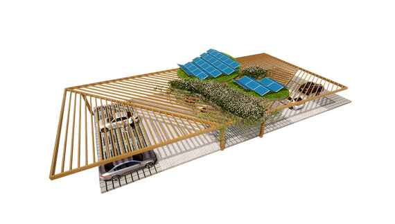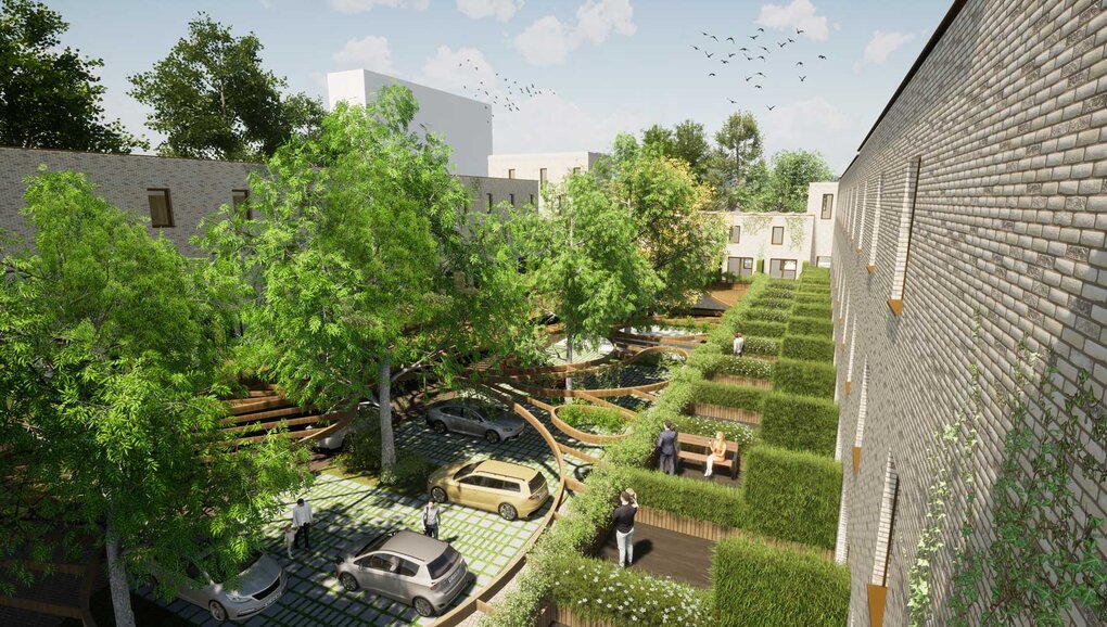 Integraal duurzaam, betekend niet alleen een duurzame openbare ruimte, maar ook in het binnengebied. De pergola is de gemeenschappelijke duurzaamheidsfeature. Hierin komen alle oplossingen voor de transities en alle duurzaamheidsambities samen in één element. Samen sterk voor water, hittestress, flora en fauna. De pergola vormt een architectonisch element, enerzijds om de auto’s uit het zicht te halen en te vergroenen, anderzijds om de duurzaamheidselementen een plaats te geven. Hierop komen delen van sedumbeplanting en zonnepanelen en bieden schaduw tegen overhitting van auto’s. De pergola is begroeid met klimplanten, die nectar voorziet aan hommels en bijen. Daarnaast heeft de pergola grote openingen om bomen een plek te geven. Zo is er groot en klein groen in de binnengebieden.