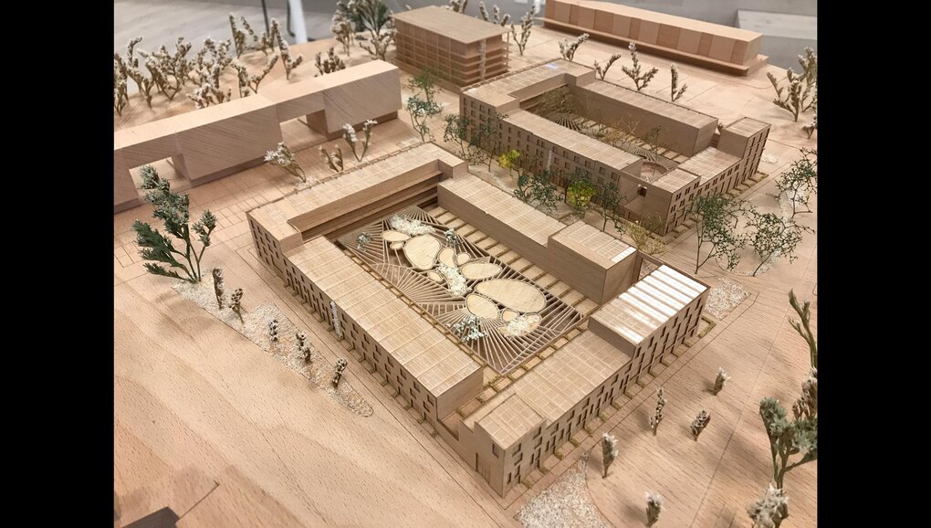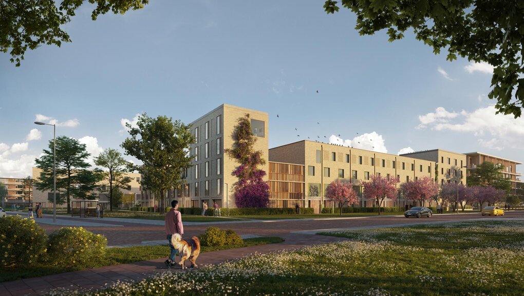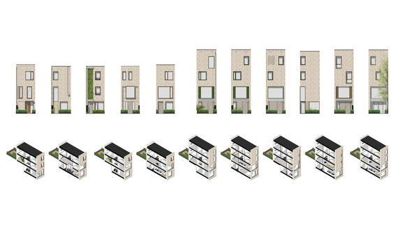 De orthogonale planopzet vanuit de naoorlogse stedenbouw wordt vastgehouden binnen ons plan. De bouwblokken zijn los geplaatst in de groene ruime leefomgeving.Doordat de bouwblokken verspringen ten opzichte van elkaar, komen er vrije ruimtes voor groeninvulling. De hoekverdraaiing is te zien aan de noordzijde langs de Floris de Vijfdelaan. Dit resulteert in de groene wiggen, de driehoekige vormen van de openbare ruimte. Wij maken op de hoek een accent als scharnierpunt naar de Dirk de Derdelaan. Deze wordt begeleid door een reeks volumes die oplopen tot aan het stedenbouwkundig accent met het vrijliggende appartementengebouw aan de zuidzijde.