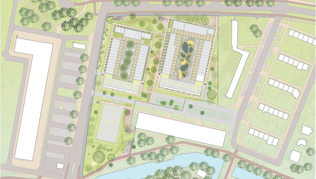 Door minimale infrastructuur te maken, hebben we een gehele groene zone waaraan gewoond wordt, De Groene Vallei. Het concept van de verschillende groenschalen is doorgezet in De Heemtuinen. Het kleinste groen aan de gevel met geveltuintjes, de groen omzoming van de bouwblokken naar de grotere schaal van de noord-zuid verbinding van de groen-blauwe ruggengraat van het plan.