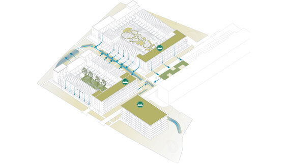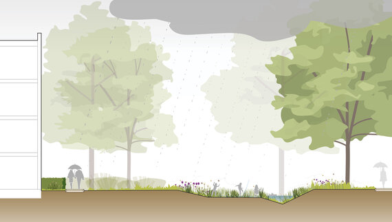 De Noord-zuid verbinding is de groenblauwe ruggengraat van het plan, als een groene vallei van woning tot openbaar gebied, alles is in het groen gehuld. Het groen komt zelfs terug in de architectuur. Door de verticale groenpanelen in gevels, de plantenbakken en hagen. Hier is er plaats gemaakt voor een plantsoen met een waterinfiltratiezone die het hemelwater vasthoudt en langzaam laat infiltreren. Dit is ook de waterbeleving en het weer van de week dat hier zichtbaar wordt.De voordeur uit en spelen maar. Er staan geen auto’s voor de deur, want hier is het groen. Spelen en bewegen wordt gestimuleerd door de boomstammen, die als evenwichtsbalk over de wadi’s heen liggen. Door de rijke bloemenvelden en bijbehorende biodiversiteit uit het Heempark hier door te trekken, is de vallei een verlenging van het Heempark. Naast kleine beplanting maken we ruimte voor grote bomen. Deze geven schaduw tijdens de hitte van extreme zomers van nu.