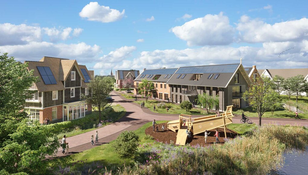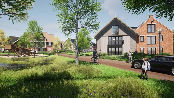 Het omliggende landschap wordt door middel van doorzichten tussen de woningen, panorama’s en de verbinding naar het kerkepad beleefbaar en toegankelijk gemaakt. Woningen in het landschap vormen een overgang van het landschap naar het dorp. Als je de woonbuurt binnenrijdt zie je meteen de Duinbeek. De ecologische landschappelijke inrichting rondom de grote speelplaats voelt aan als een park. Bij het verder oprijden van de ringweg zie je door de houtwal de spitse toren van de OLV-kerk. Met een lichte slinger in de weg rij je rustig naar je woning. De ringweg gaat langs alle woningen en langs de Duinbeek.